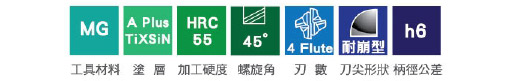 採用高硬度、強韌性的超微粒鎢鋼材料,加工高硬度材料時仍能維持刀具高穩定性。